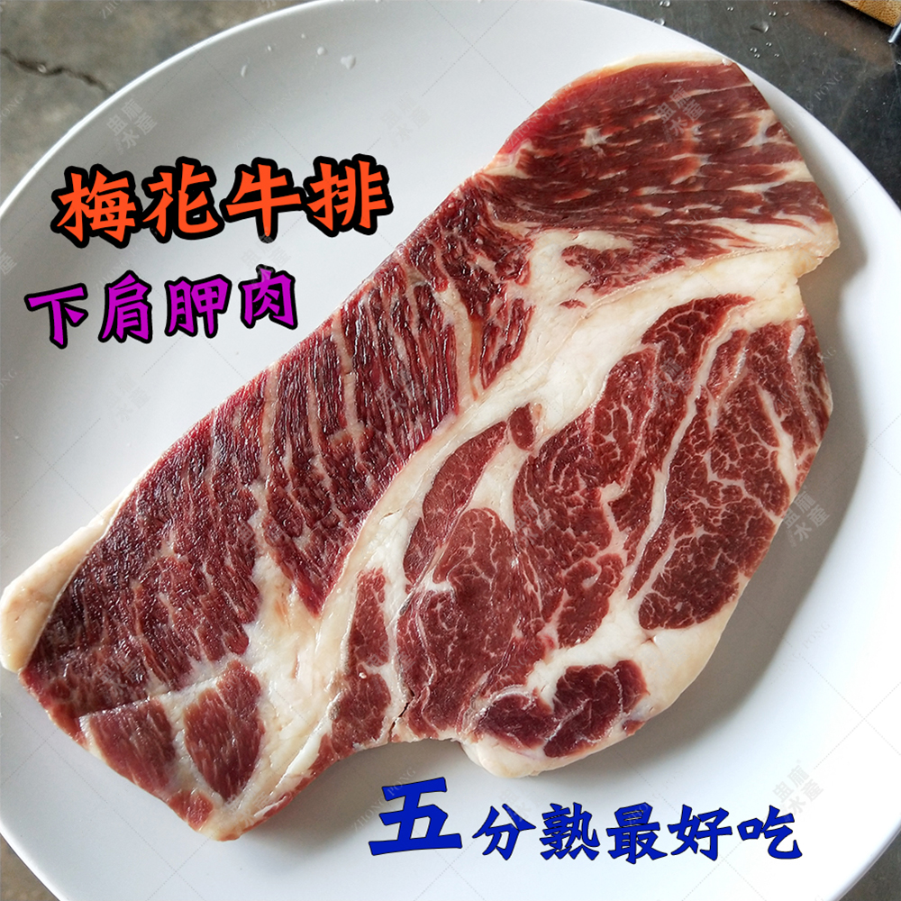梅花牛排是,牛隻的下肩肉部位,此部位肉質結實帶油筋且油脂甚多,非常適合以煎、烤的方式料理,煎或烤至五分熟,最能表現牛排的美味,在烹調的過程中油脂會滋滋地流出,肉汁四溢的超完美口感,油花均勻分佈、鮮嫩多汁,每一口接讓人食指大動,在家就可以變大廚。(此部位的牛排,勿超過六分熟喔,五分熟的口感最好)