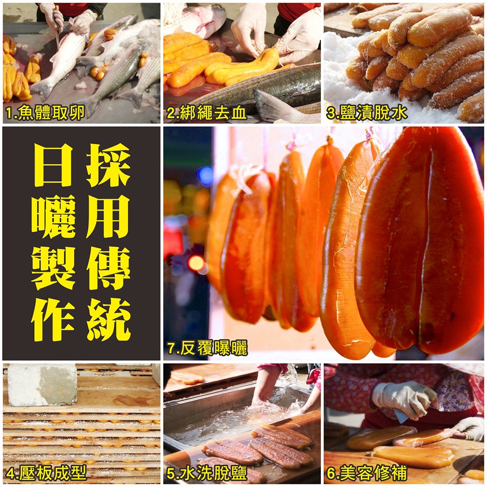 挑選新鮮捕撈的烏魚,以純熟的手法輕輕劃開魚肚,小心的將珍貴的魚卵取出,動作輕柔但又精確。