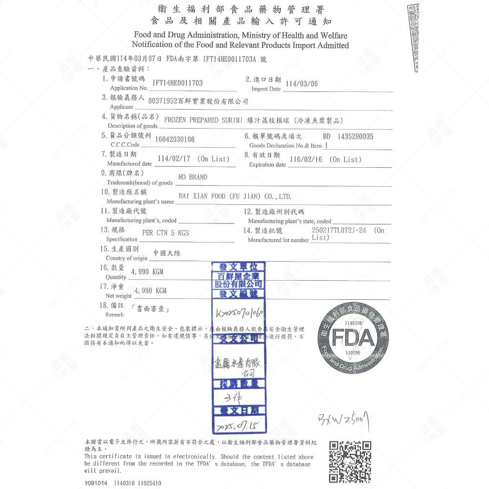 商品名稱:爆汁荔枝模球(冷凍魚漿製品)
