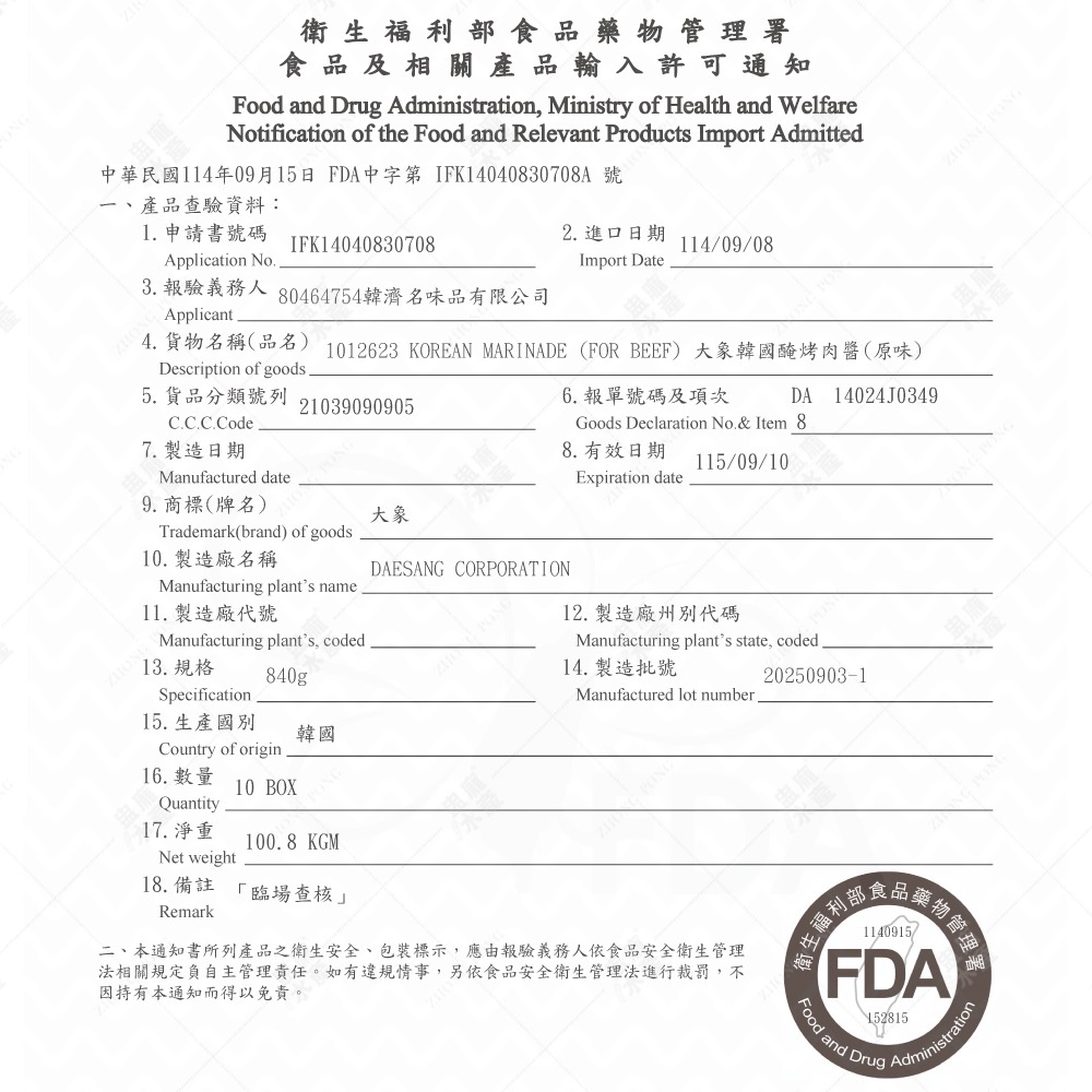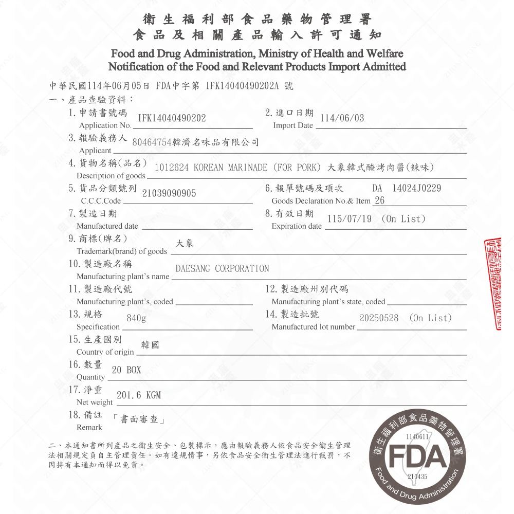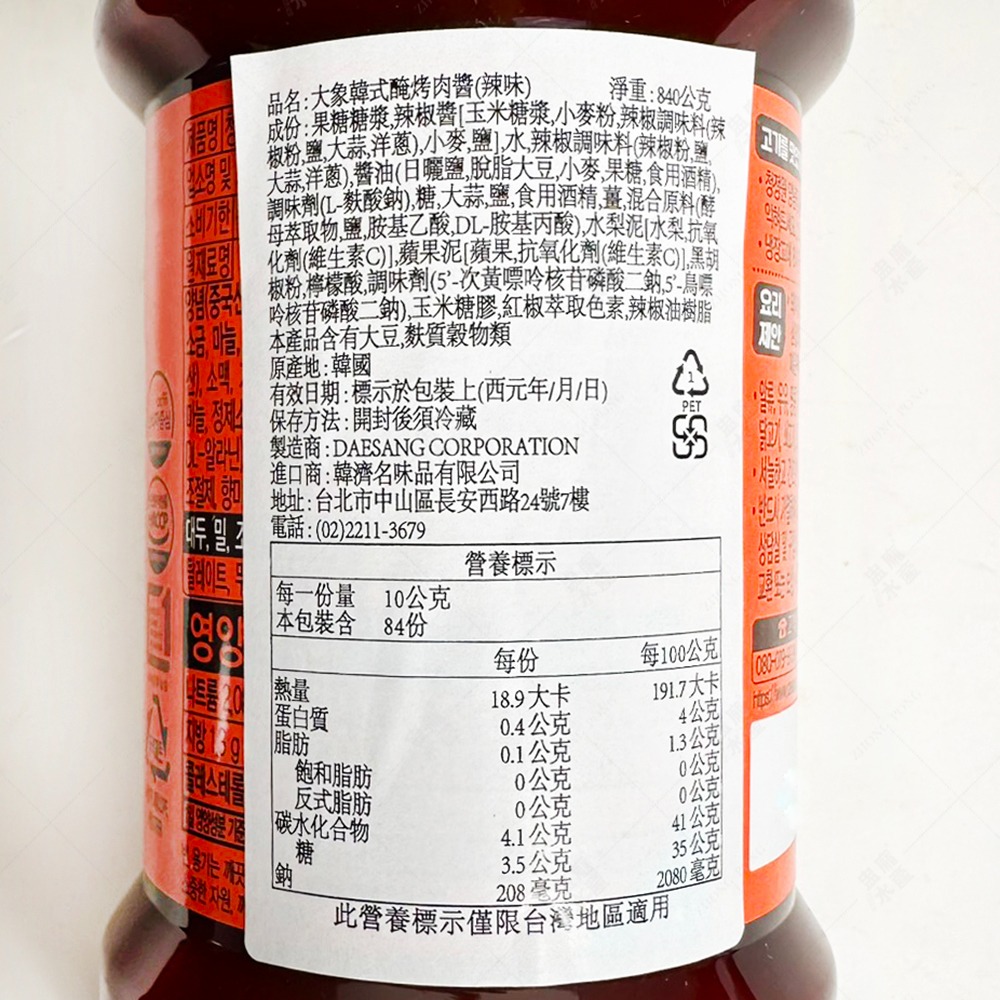 商品名稱:大象韓國醃烤肉醬(辣味)