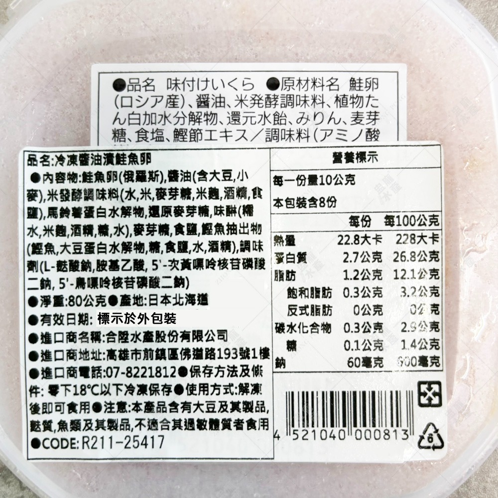 商品名稱:冷凍醬油漬鮭魚卵(80g)