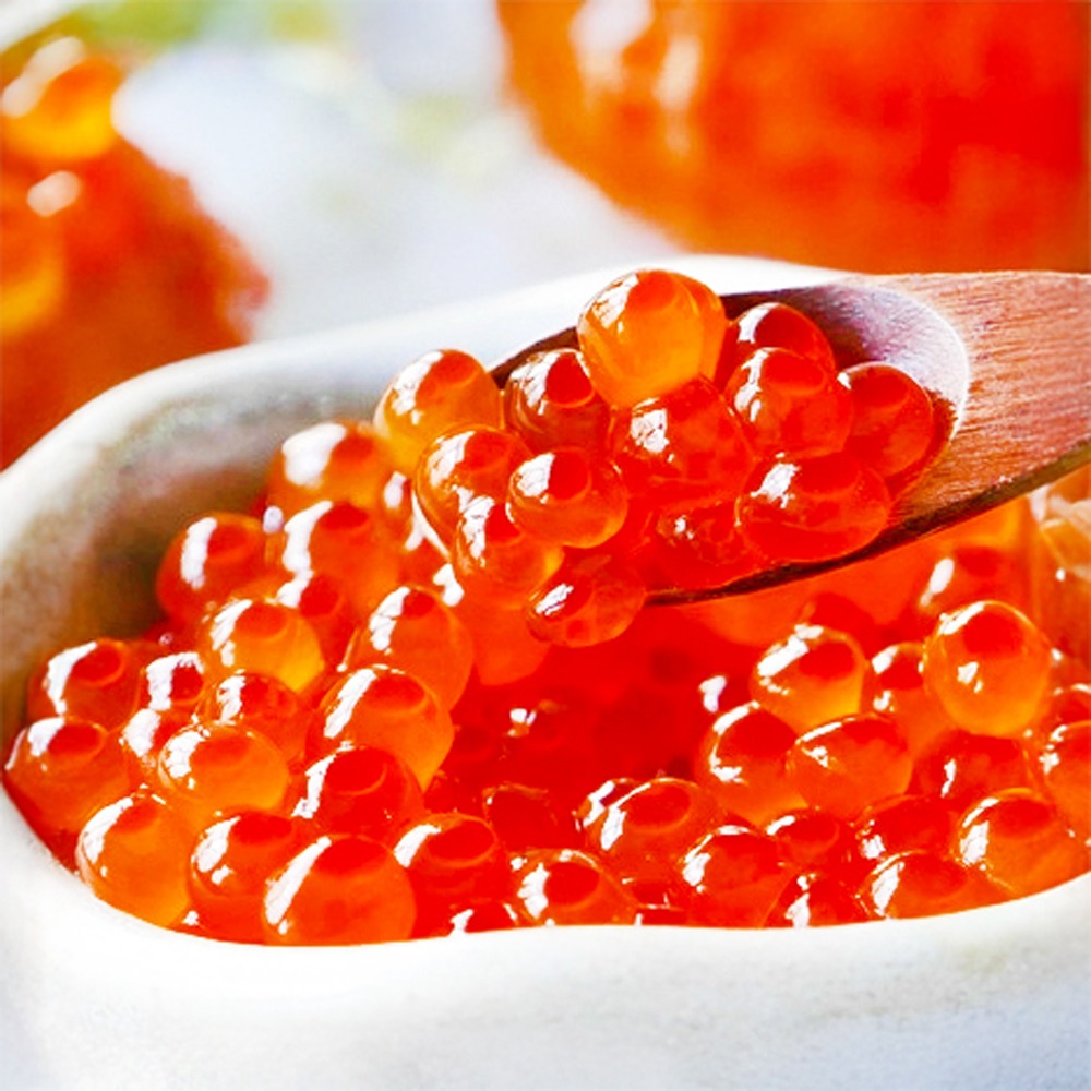 嚴選鮭魚卵晶瑩飽滿,醬漬後風味柔順細緻,是料理妝點與提味的絕佳食材。輕放入口,金亮鮭魚卵在舌尖「滋」的一聲爆開,濃郁深海鮮甜隨即散發,Q彈口感令人回味無窮。因產量稀少,更被譽為珍貴的海中仙物。
