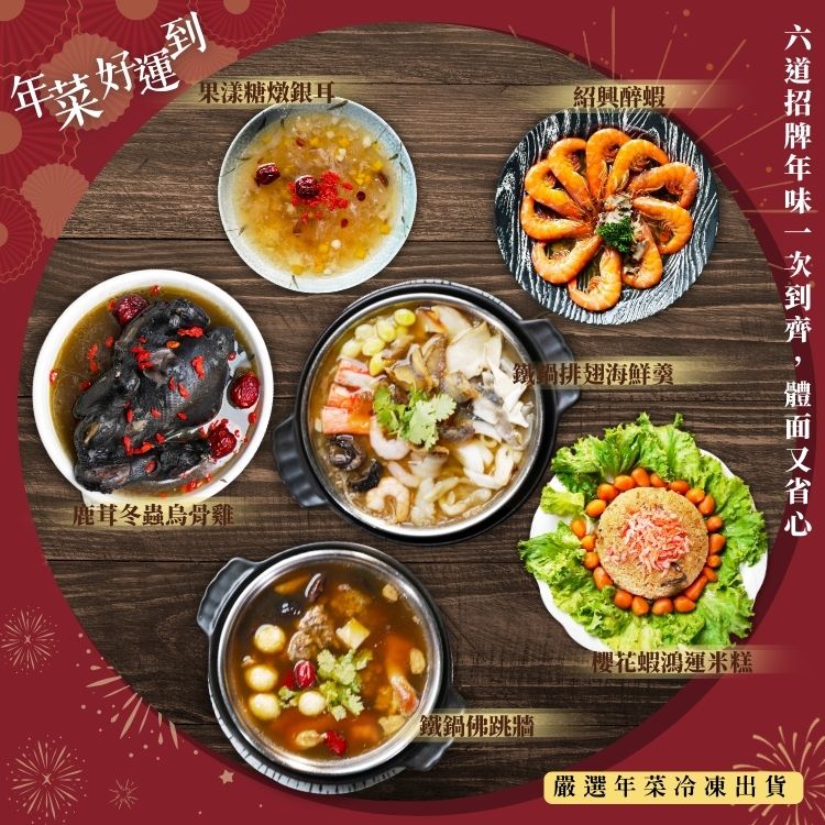 以六道精選年菜打造溫馨又體面的團圓盛宴,適合6~8人共享(依食量而定)。套餐匯集海陸佳餚:濃鮮滑順的排翅海鮮羹,搭配用料豐富、香氣飽滿的經典大菜-佛跳牆,餐桌氣勢瞬間升級。清爽入味的紹興醉蝦與滋補暖身的鹿茸冬蟲烏骨雞,為年節添上滿滿幸福。