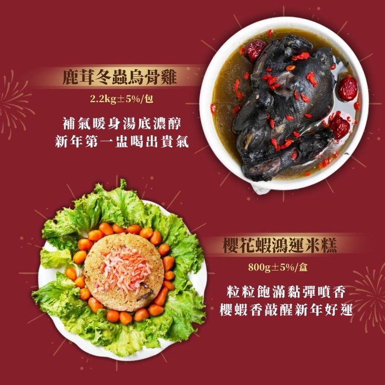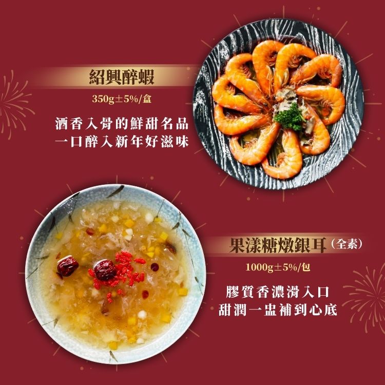 主食選用香氣迷人的櫻花蝦鴻運米糕,口感紮實又寓意好運滿滿。最後以清甜爽口的果漾糖燉銀耳作為完美收尾,為家人帶來輕盈甜味。也歡迎加購更多商品,讓您的年夜飯更加豐盛喜氣!