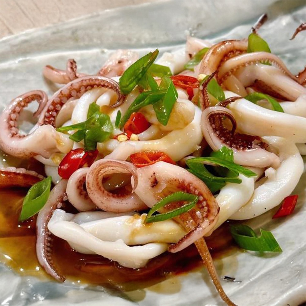來自菲律賓外海,軟絲Q彈鮮甜,川燙後,將其冰鎮放涼,沾五味醬或芥末,很適合夏天消暑和好友小酌時當下酒菜。
