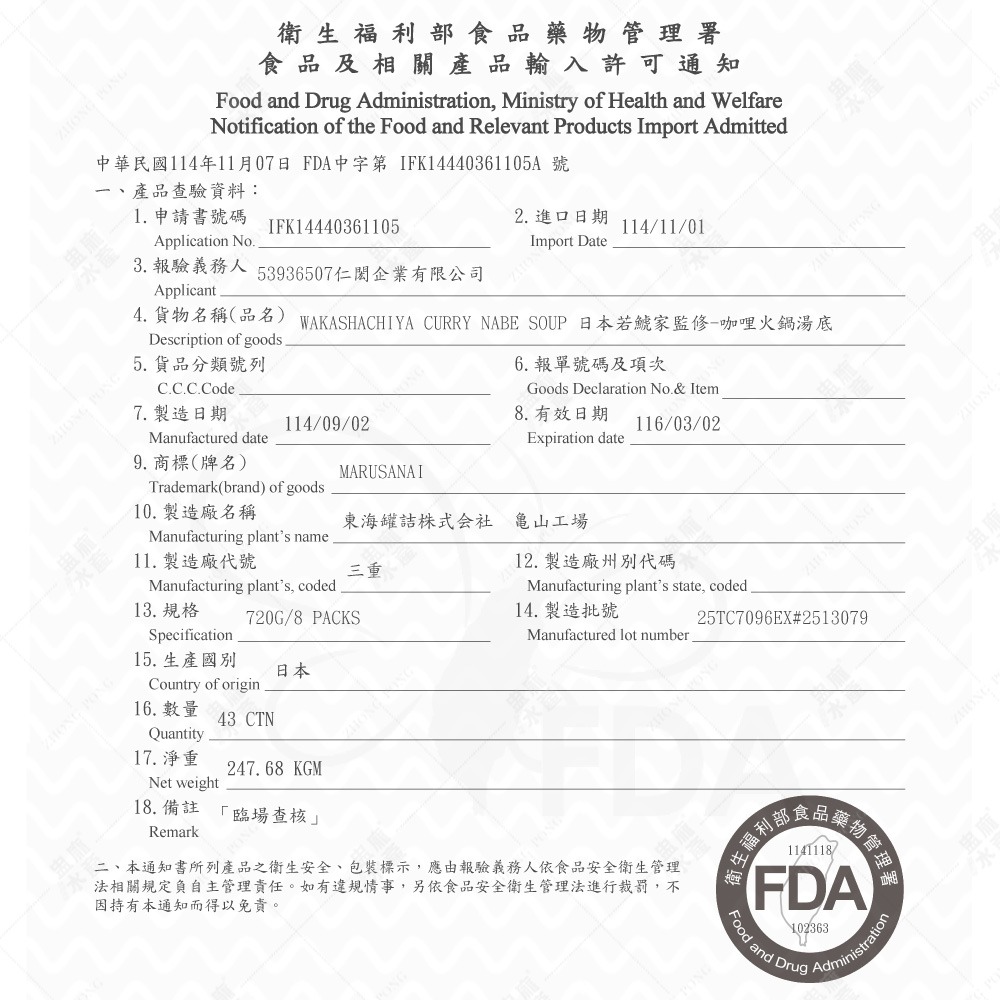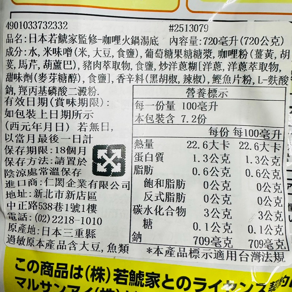 商品名稱:日本若鯱家監修(咖哩火鍋湯底)