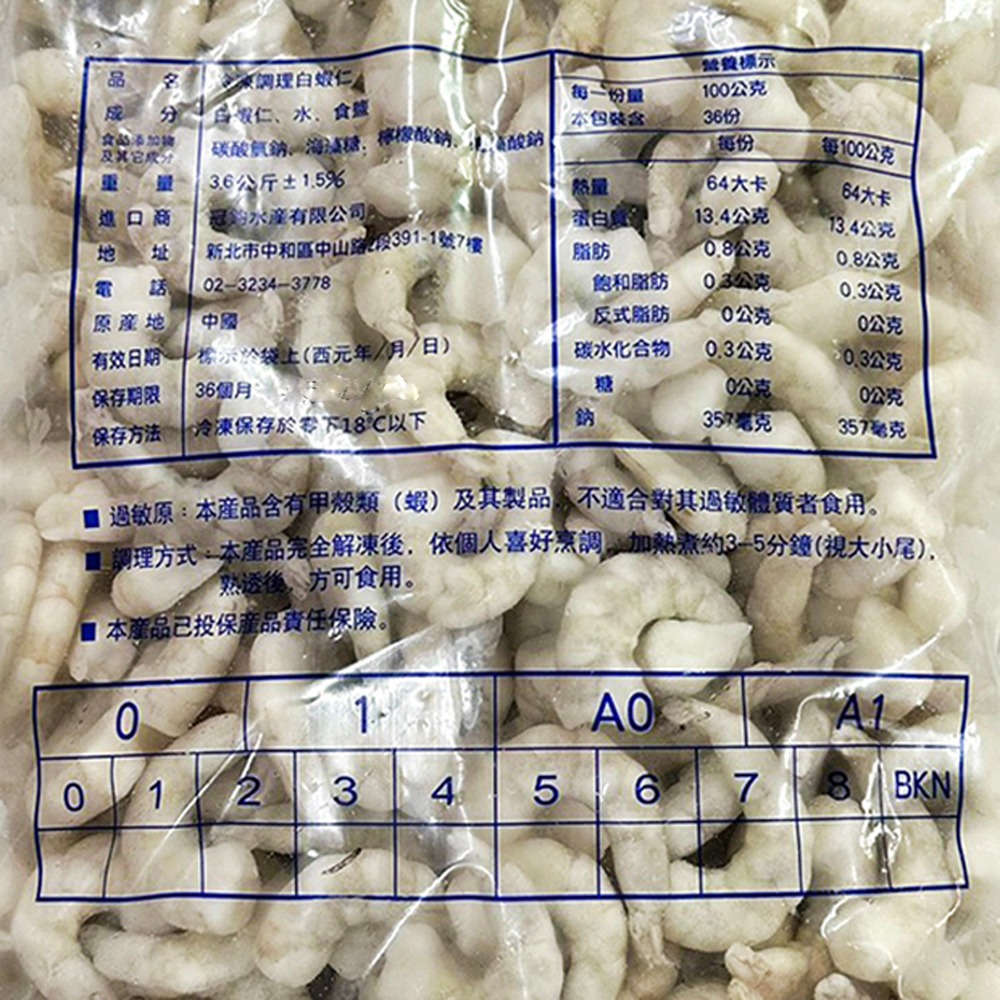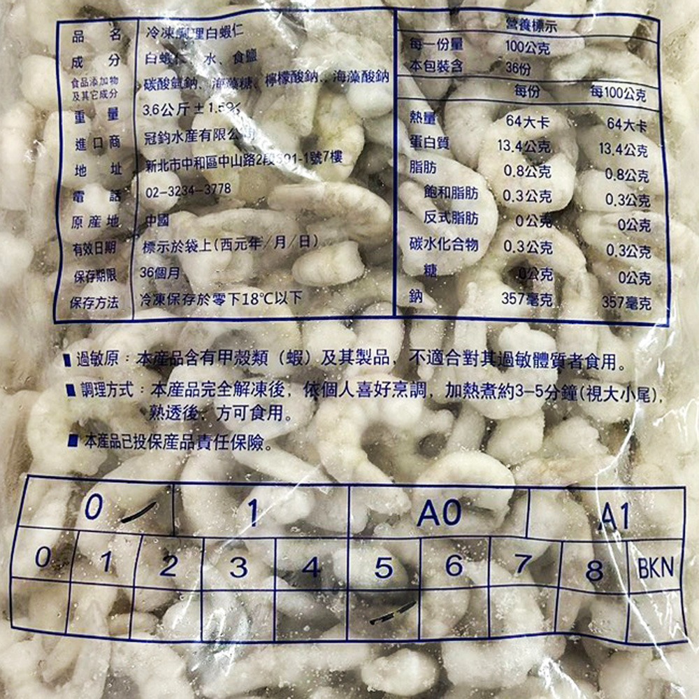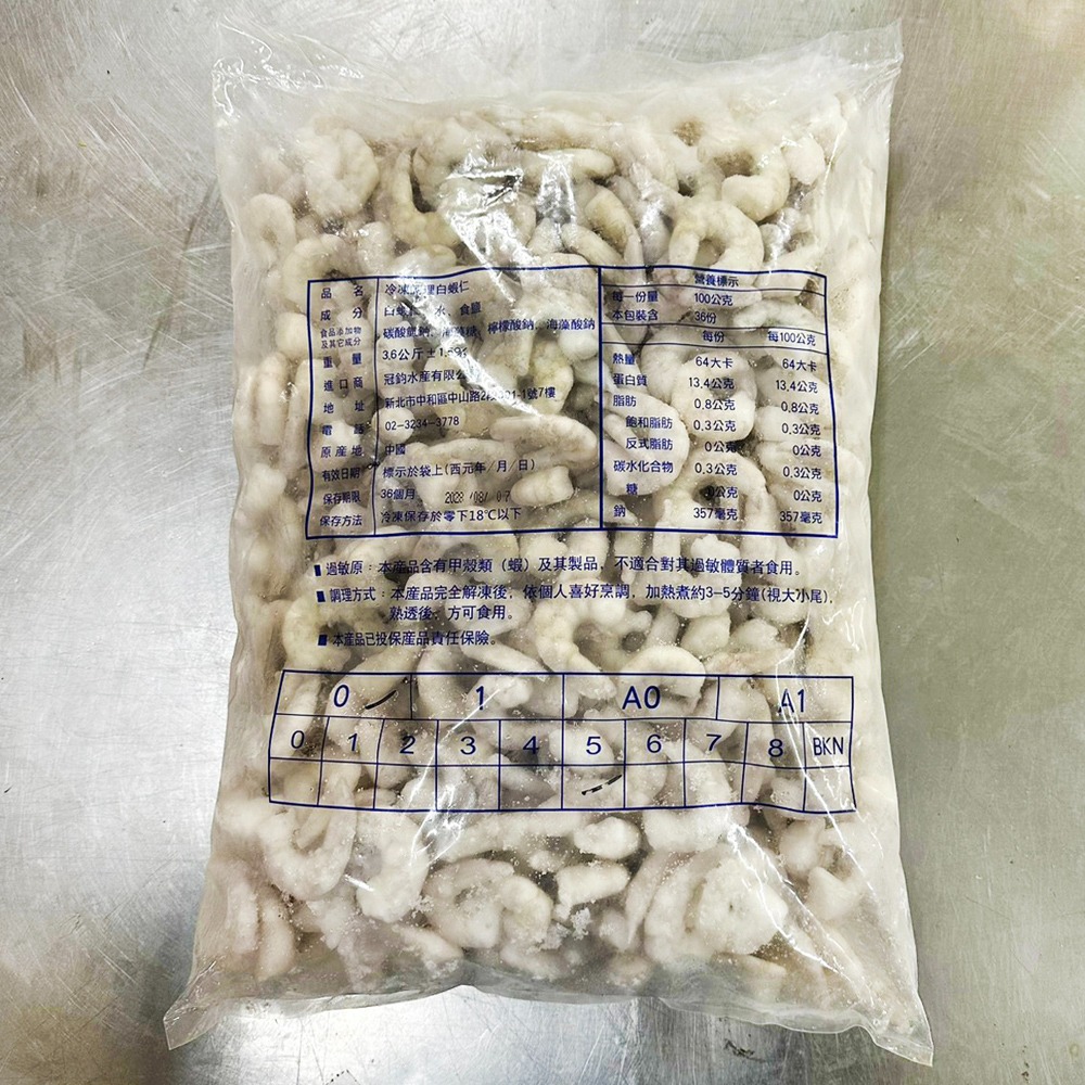 商品名稱:21/25冷凍調理白蝦仁(無割背,成品)(3號)(3.6公斤裝)