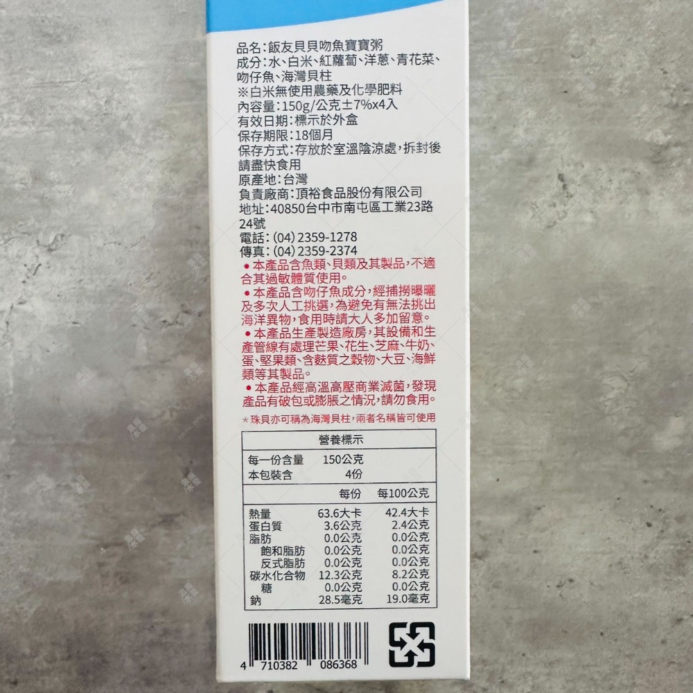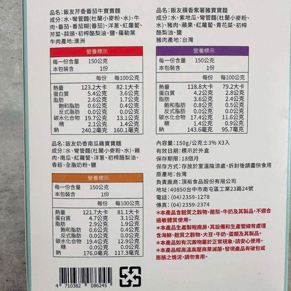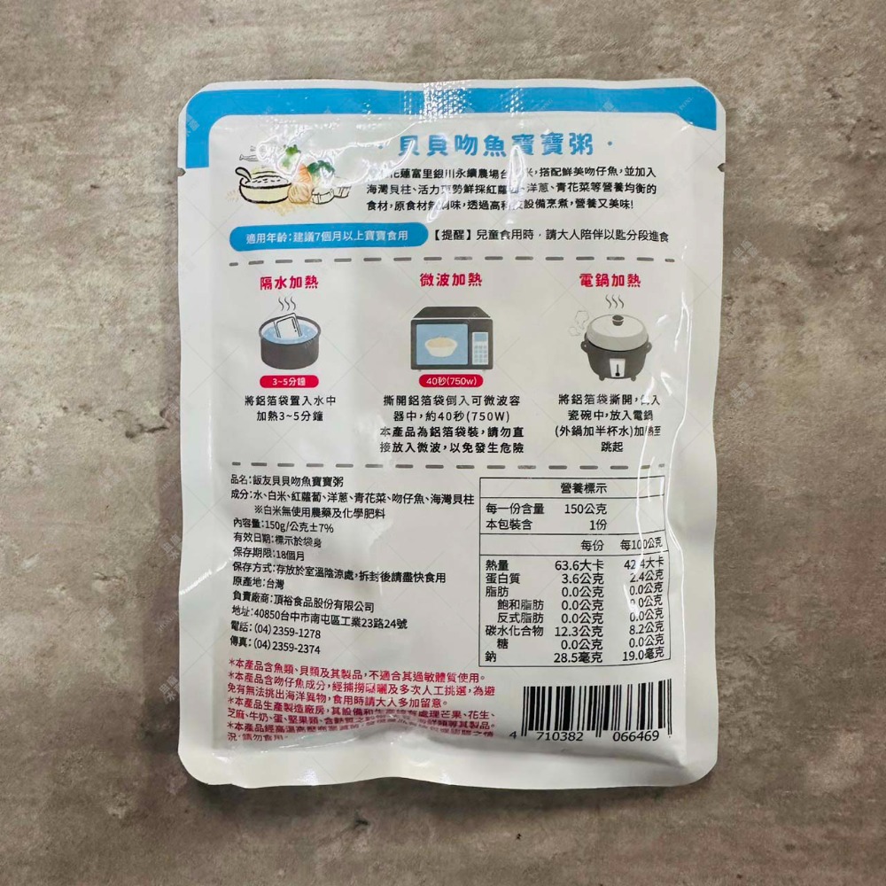 飯友寶寶系列專為1歲以上寶寶設計,包含貝貝吻魚寶寶粥、寶寶麵3in1嘗鮮組與寶寶燉飯3in1嘗鮮組。粥品選用細緻吻仔魚,柔軟易吞;麵條搭配 So Much 低溫初榨酪梨油,口感滑順;燉飯使用銀川永續農場台灣米,米粒軟嫩好入口。三款產品營養均衡、簡單加熱即可食用,方便家長準備副食品,讓寶寶安心享用美味又健康的一餐。